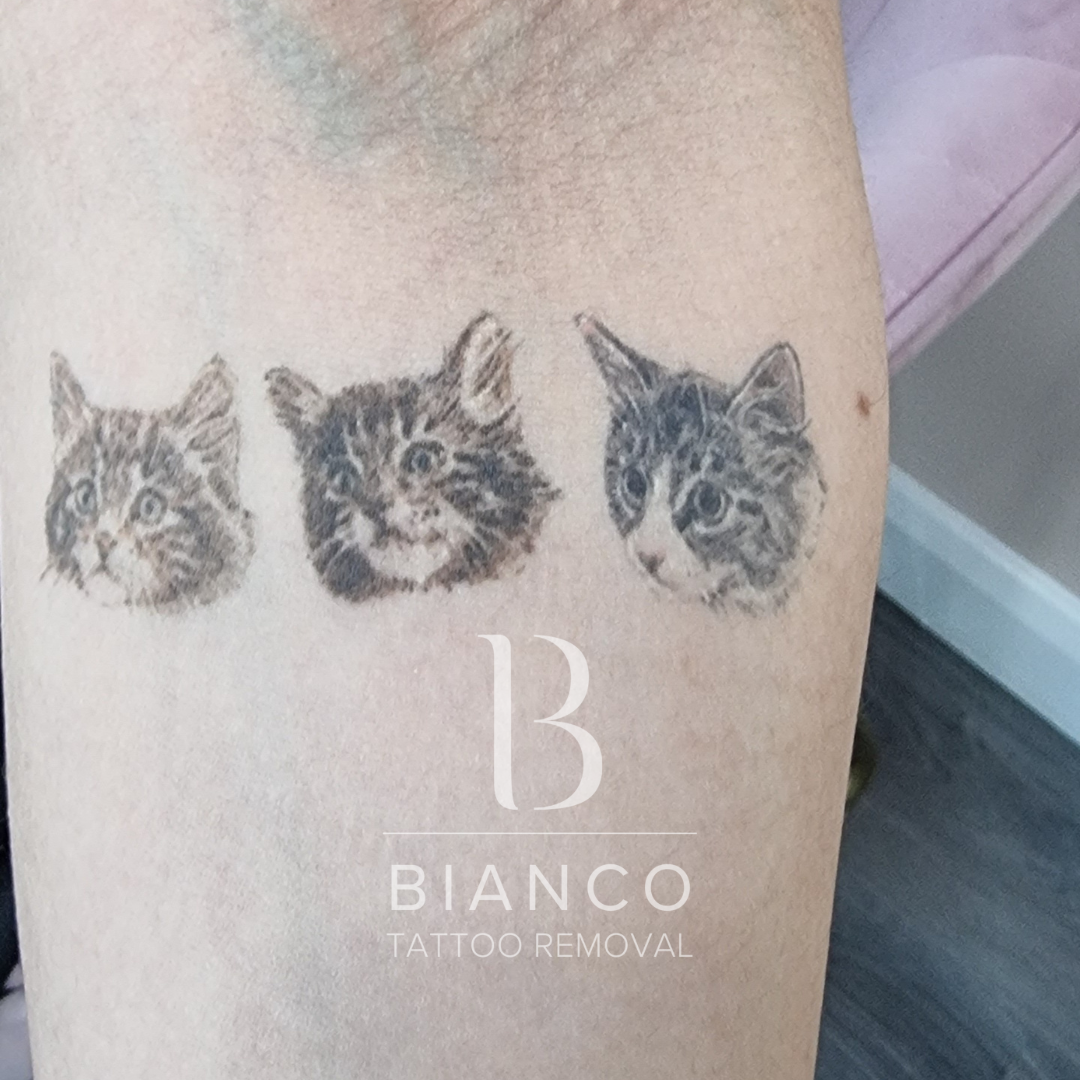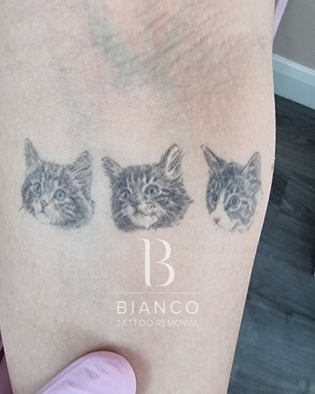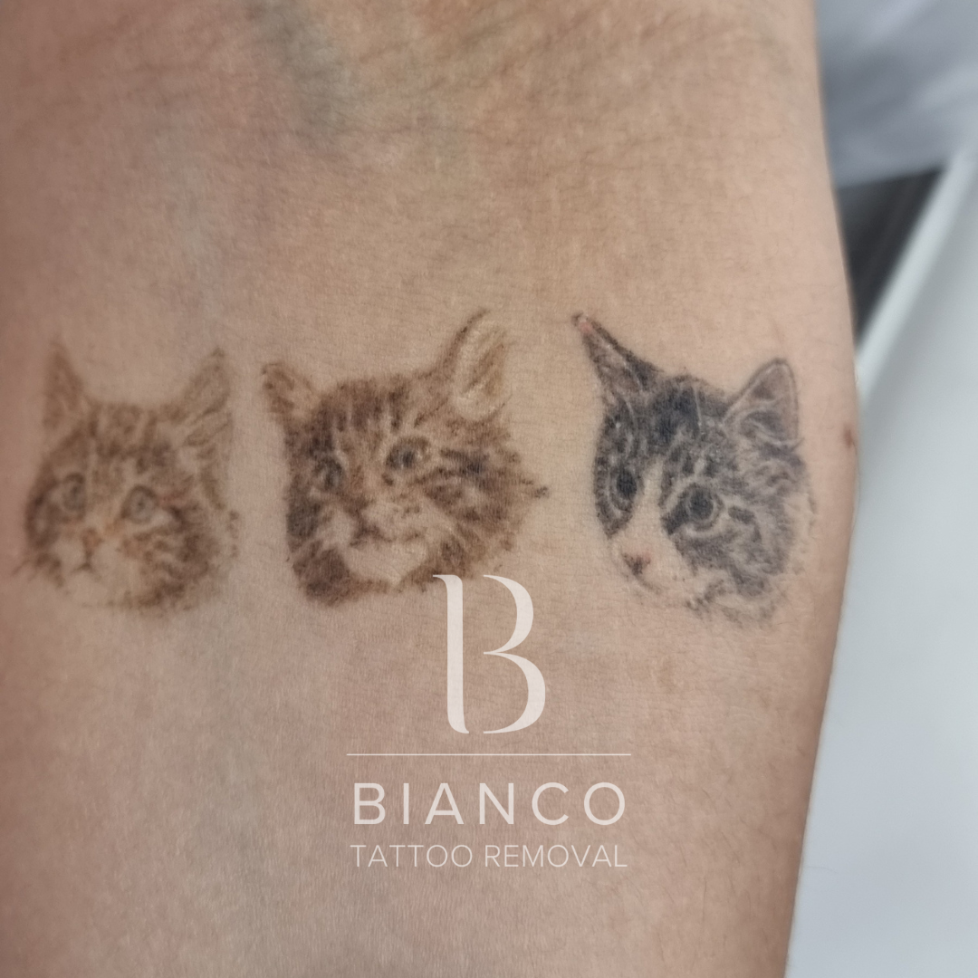 As pictured, Annabelle’s cat tattoos were gradually and safely reduced using our pico laser, with full removal achieved and healthy, clear skin left intact.