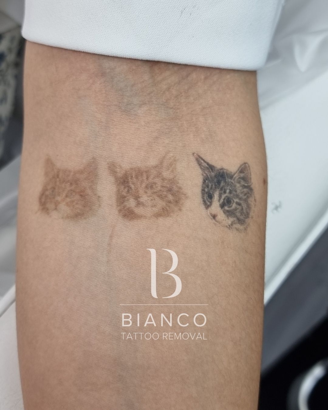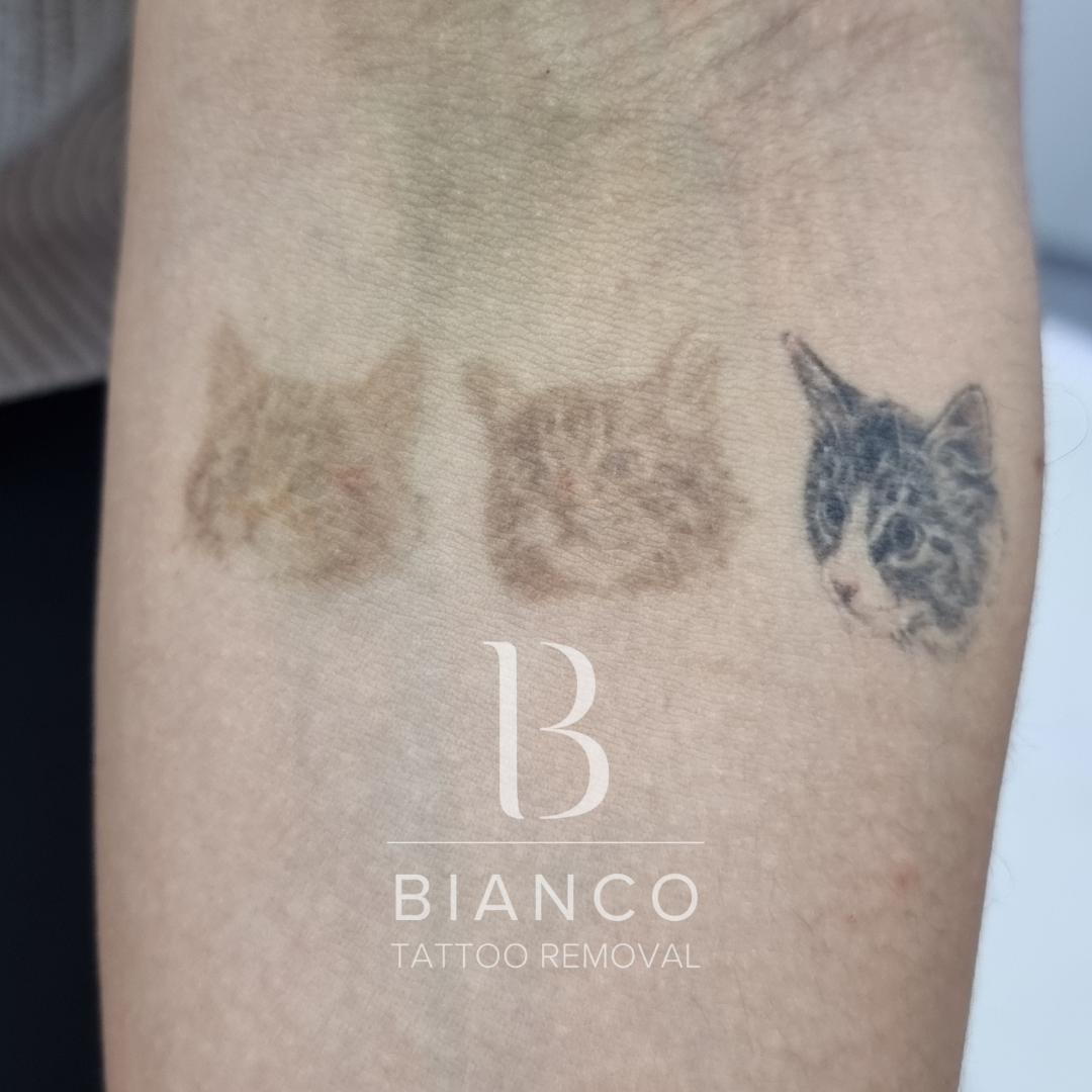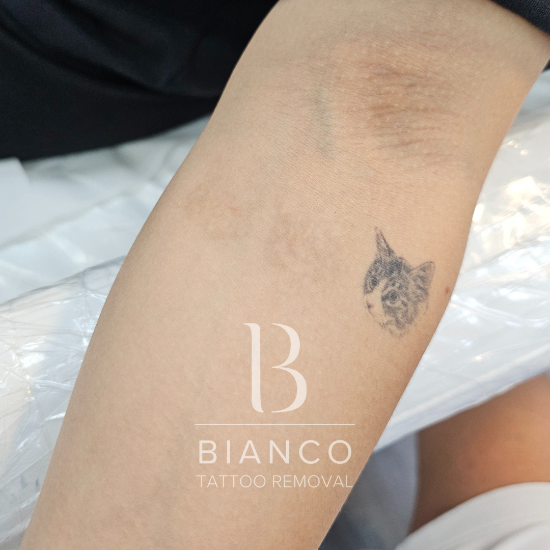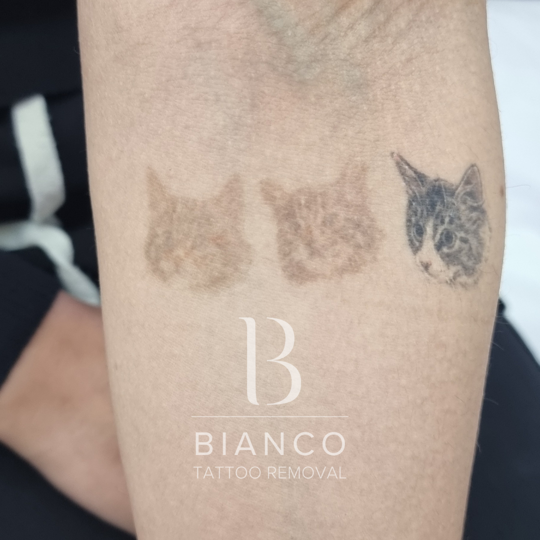 Laser tattoo removal experts at Bianco Beauty often advise clients that it can be a good idea to remove multiple tattoos at the same time as your immune system is already working to remove one tattoo, this way you can save time and money as you are not removing them one-by-one- but it depends on many factors. While her cherry tattoo removal is still ongoing due to how deep it is, scroll to the bottom to see her complete removal of her cat tattoo.